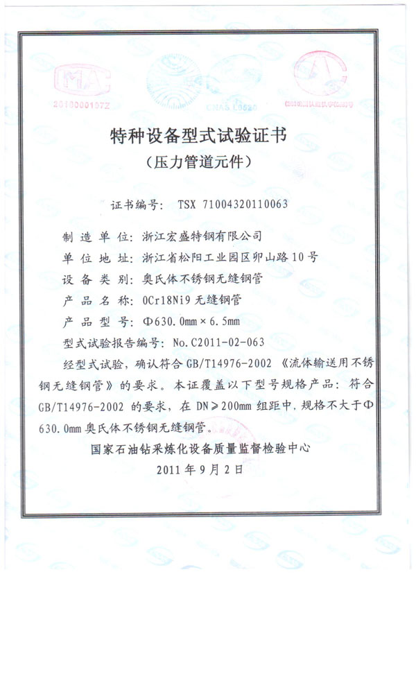 我們公司制造 牌號:0Cr18Ni9 規(guī)格:630mm×6.5mm 的大口徑薄壁不銹鋼管(無縫),通過國家石油鉆采煉化設備質(zhì)量監(jiān)督檢驗中心的特種設備形式試驗,證書編號:TSX 71004320110063 代表著我們在大口徑薄壁不銹鋼管(無縫)的制造技術(shù)在國內(nèi)處于領(lǐng)先的水準。目前也是浙江地區(qū)唯一可生產(chǎn)此類規(guī)格大口徑薄壁不銹鋼管(無縫)廠家。