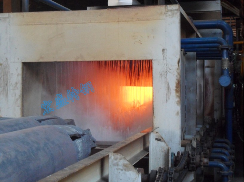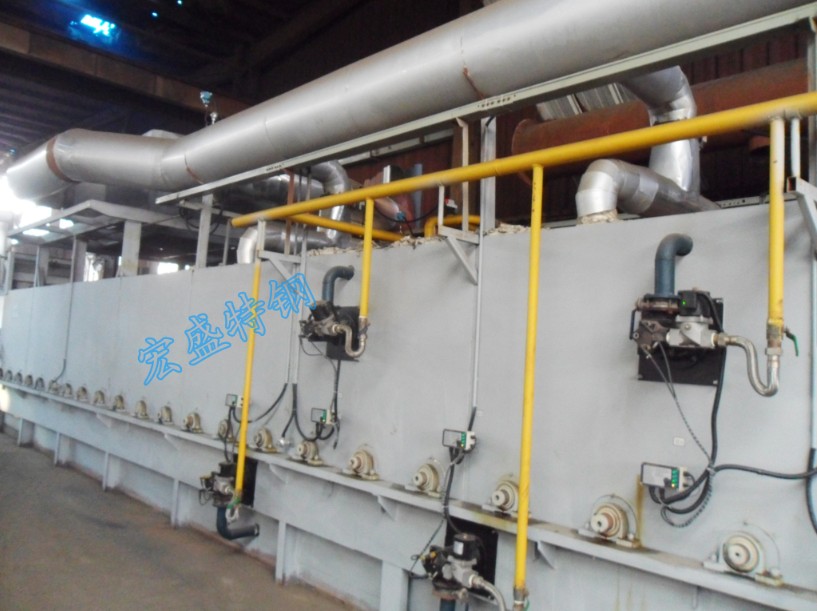 該固溶爐長20米,在結構上采用棍底連續式,包括進料臺、輥底爐、出料臺和傳動系統,在進料臺、出料臺、輥底爐內分別設置若干橫向不斷向前移動,使工件受熱均勻,無碰傷,變形小。同時由于爐內托輥始終在輥底爐內旋轉,熱能損耗相對較少,爐內熱效率高,大大減少勞動強度,并提高了工作效率。爐內設置若干內控溫度控制裝置,提高了工件在爐內溫度的測量精度,提高了控溫精度,降低了能耗。在燃料使用上,摒棄了以往傳統燃料——煤,而采用更為清潔環保的燃氣,推動了公司優化能源結構、節能減排的工作進度,及為可持續發展提供新的動力。宏盛特鋼將以此為契機,穩步發展,為客戶提供更加優質的不銹鋼產品。